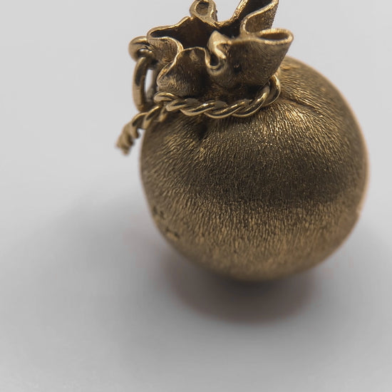 With its smooth rounded form and tied top, this vintage charm captures the whimsy and optimism of the 1960s, making it both a conversation starter and a collectible keepsake. Whether worn as a playful talisman of good fortune or simply enjoyed for its craftsmanship, it’s a golden nod to prosperity.