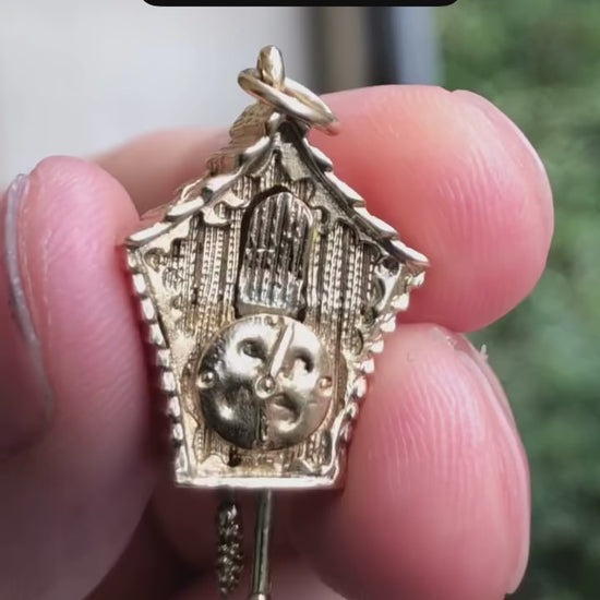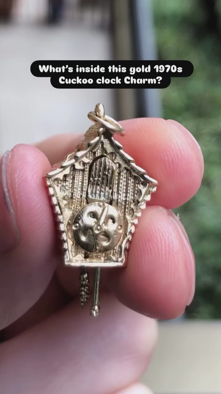 What makes this charm extraordinary is its hidden surprise: press the hanging clock chain, and a tiny yellow enamelled cuckoo bird emerges from its little door, just as the real clock would announce the hour. Whimsical and beautifully engineered, it showcases the playful spirit and craftsmanship of 1970s jewellery design.