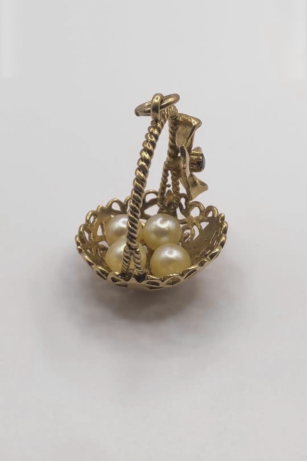 Adorning the basket’s golden ribbon is a deep red garnet, adding a touch of warmth and passion to this already enchanting design. The contrast of soft, creamy pearls against the rich gold and garnet makes this charm a miniature masterpiece of texture and tone.