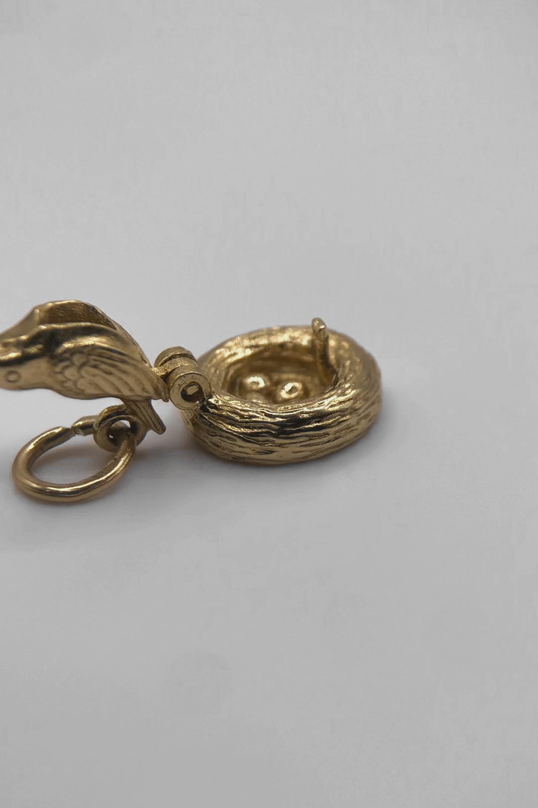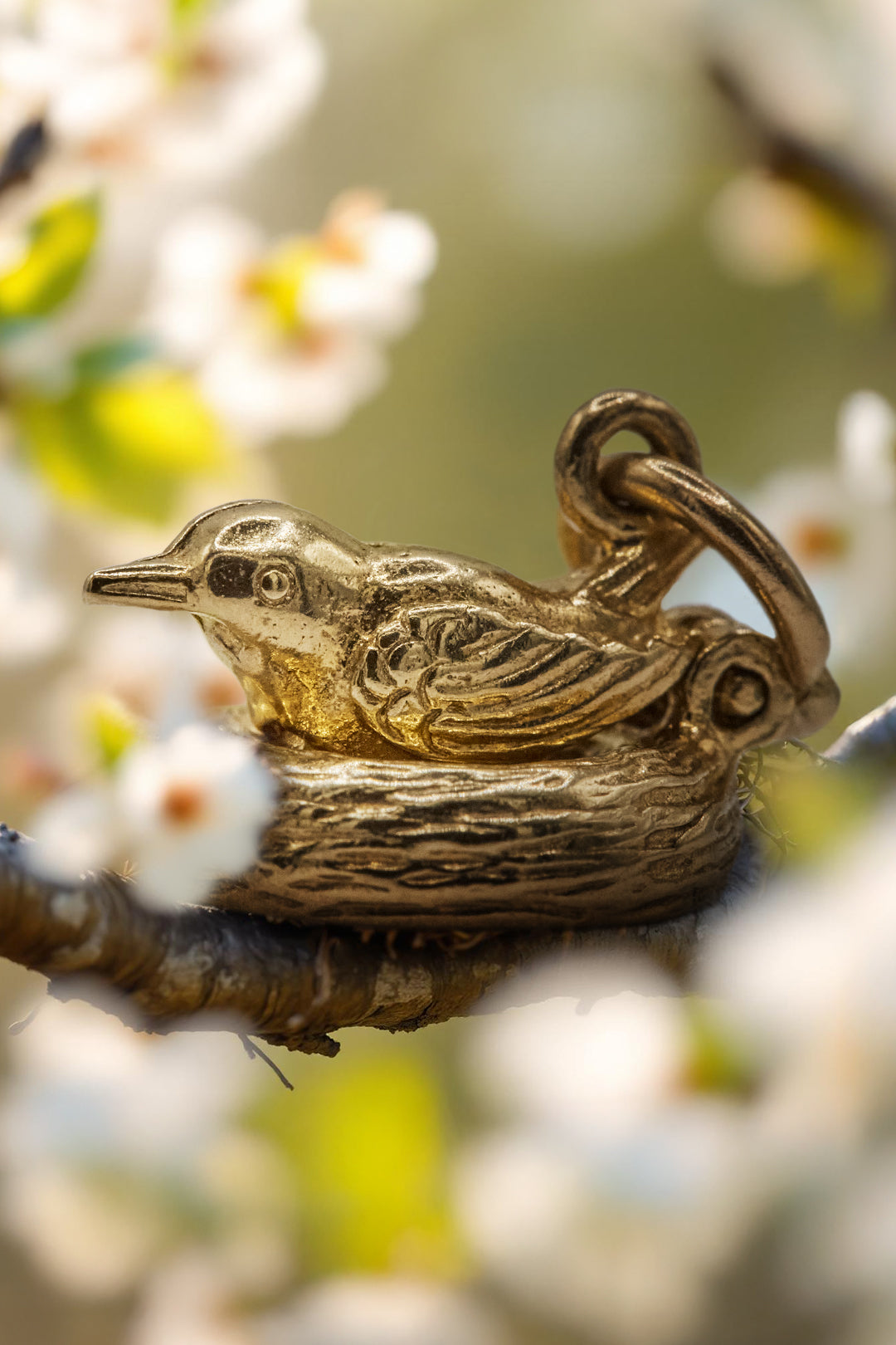 Sweet, intricate, and full of hidden charm, The Opening Adorable Bird in a Nest Charm is a delightful miniature crafted from solid 9ct yellow gold. Nestled inside a finely detailed nest, a golden bird sits peacefully — and when gently lifted, it reveals a hidden cluster of tiny golden eggs beneath.